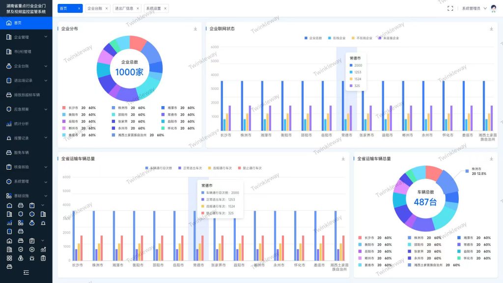 - 空间可视化:以饼图清晰呈现企业区域分布(含本地及全省同类型企业占比),同步展示运输车辆总量及区域构成,直观掌握资产布局;