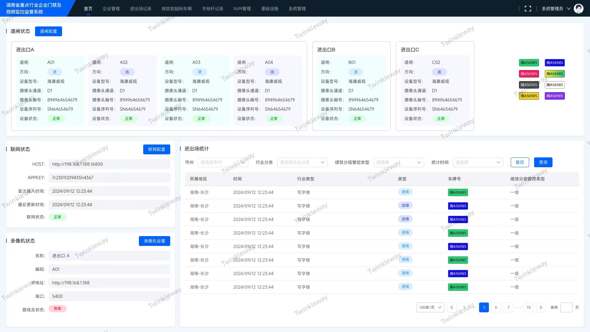 联网状态、录像机状态同步监测,异常及时预警;进场出场统计功能,按州市、行业分类等多维度筛选查询,车辆通行数据清晰规整,助力企业精准掌握人员与车辆流动。