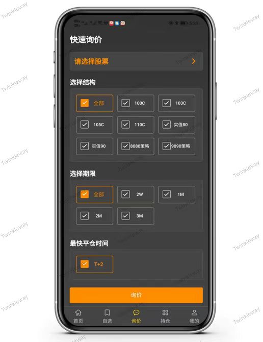 3、询价:提供提交询价功能,搭配股票选框精准筛选标的、条件选择细化交易要求,同时展示交易需知,让投资者清晰规则,高效发起交易需求,如APP中可选择股票、结构、期限等条件快速询价 。