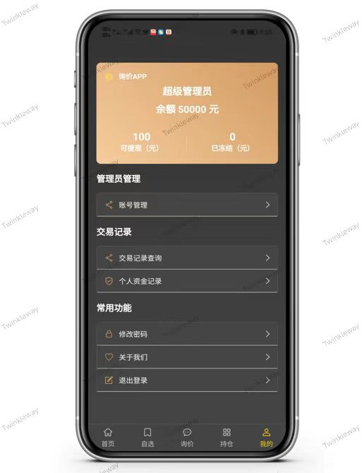 5、我的:集成账户核心管理,包含交易记录、资金流水查询,密码修改;可查阅系统公告、免责声明、隐私政策;管理员端在此开展用户管理,兼顾自主管理与平台管控,如APP“我的”模块呈现账户余额、管理员管理等功能 。