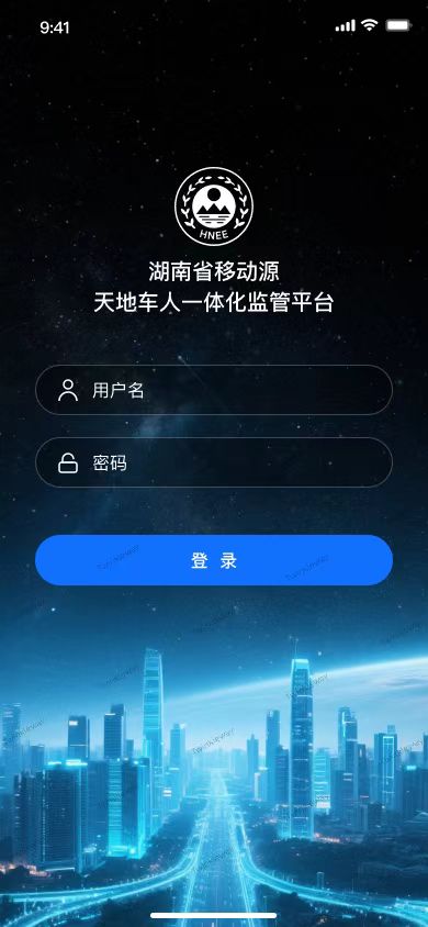移动端登录页以 未来感城市夜景 为背景,中央凸显平台标识(HNEE),搭配“用户名+密码”双输入框与蓝色登录按钮,简洁大气,强化“数字化监管”的视觉感知。
