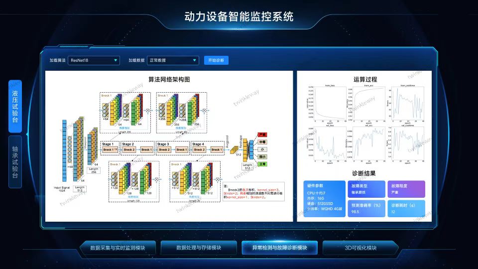 在运行参数方面,通过趋势曲线展示核功率、稳压器水位、冷却剂温度等关键数据,助力运维人员把握设备运行规律。同时,系统搭载智能诊断功能,以ResNet50等算法为依托,对液压、轴承试验台等设备数据进行分析,输出算法网络架构、运算过程及诊断结果,涵盖故障类型、严重程度等,辅助快速排查与解决问题,实现动力设备的智能、高效、精准管理,保障设备稳定可靠运行 。