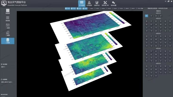 其中,“天气预报”功能进一步细化为贴合航天发射气象分析需求的子功能:“邮票图”按时间或空间序列展示风场等关键气象要素的动态变化,直观呈现气象条件演变趋势;“面条图”“二维图”“三维图”从多维度可视化呈现grads格式数据,助力分析气象要素的空间分布与垂直结构;“一维图”则聚焦文本文件数据,清晰展示气温、湿度等要素的数值变化,为发射场气象参数阈值判断提供依据。