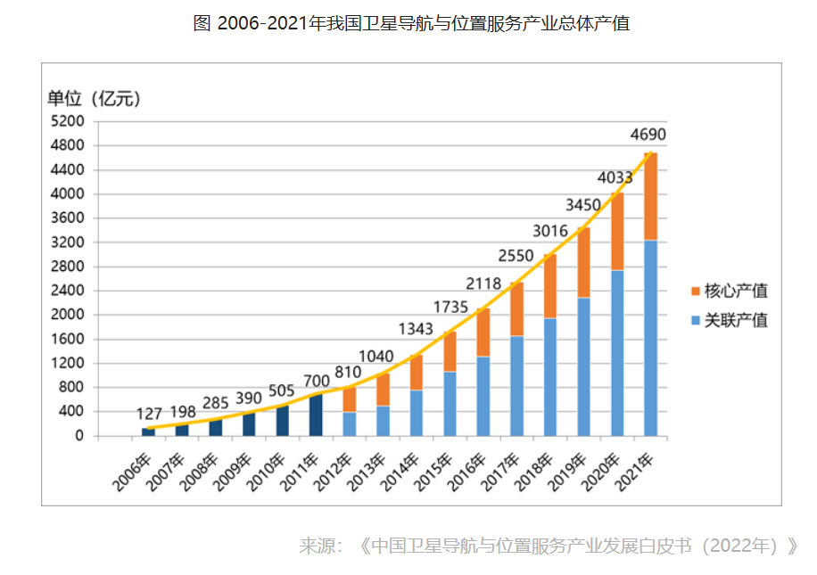 图 2006-2021年我国卫星导航与位置服务产业总体产值