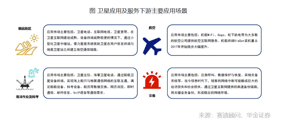 从具体应用场景来看,卫星互联网的核心应用场景主要包括偏远地区通信、海洋作业及科考、航空通信、灾难应急通信等。