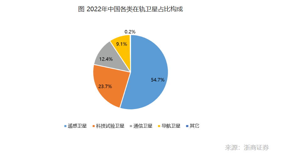 目前,我国卫星应用主要包括遥感、科技试验、通信、导航和其它。2022年,我国各类在轨卫星构成分别为:遥感占比54.7%、科技试验23.7%、通信12.4%、导航9.1%、其它0.2%。