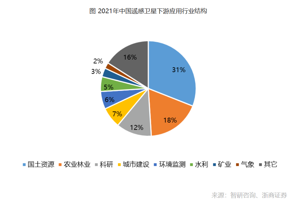 在下游的应用领域构成上,国土资源、农业林业、科研需求占比较大,分别为31%、18%、12%,接下来依次是城市建设7%、环境监测6%、水利5%、矿业3%和气象2%。